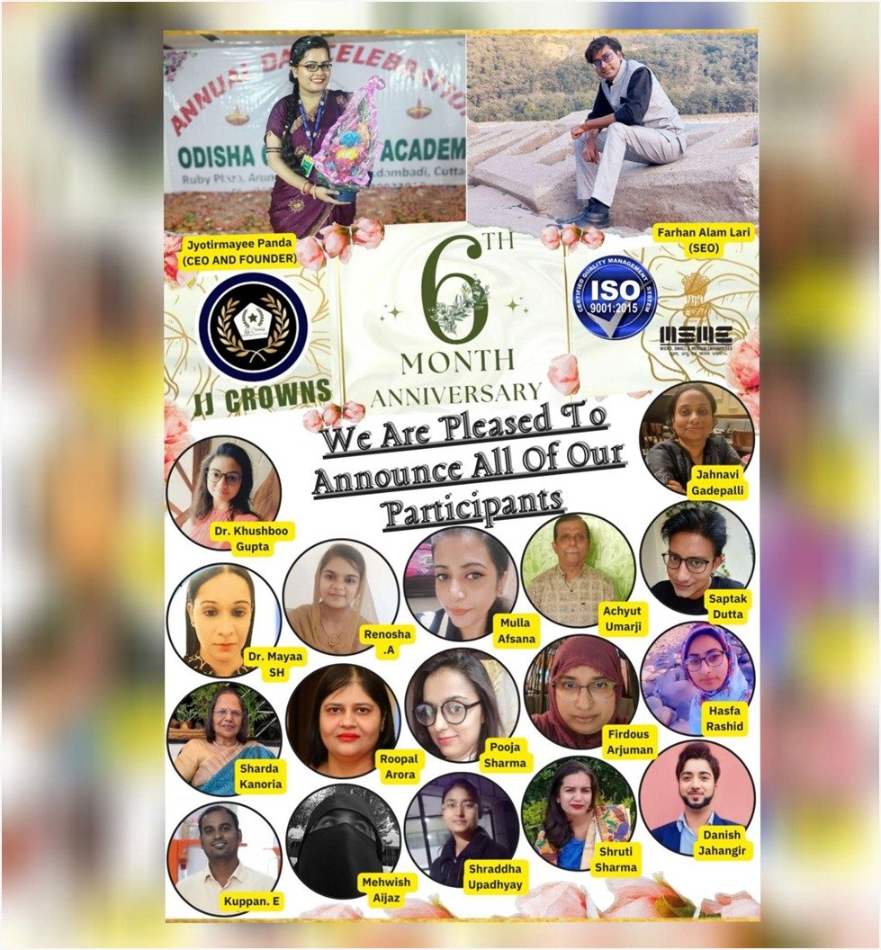 Achyut Umarji(Writing), Mehwish Aijaz(Writing), Mulla Afsana(Free style ART), Roopal Arora(Writing), Hasfa Rashid(Writing), Dr. Khushboo Gupta(Singing ), Shruti Sharma(Writing), Jahnavi Gadepalli(Art & Writing), Dr. Mayaa SH(Writing), Renosha.A(Poetry Writing), Pooja Sharma(Poetry Writing), Kuppan. E ( Poetry Writing), Saptak Dutta(Poetry WritiCelebrating 6th Months Anniversary of JJ Crowns Organization. Started this incredible journey of being an extraordinary personality begins on 2023 (Aug – 16). The journey was full of learnings and it will be. And in these 6th months we got to know thousands of people from different backgrounds, which helped us develop our own personalities. A big thank you to everyone who has been a part of this beautiful journey.